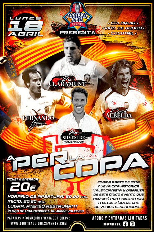 La Final de la Copa del Rey de Sevilla está muy cerca y Football Idols Events te ofrece una única ocasión e irrepetible de compartir 1 única experiencia con nuestros ídolos del Valencia C.F de todos los tiempos.